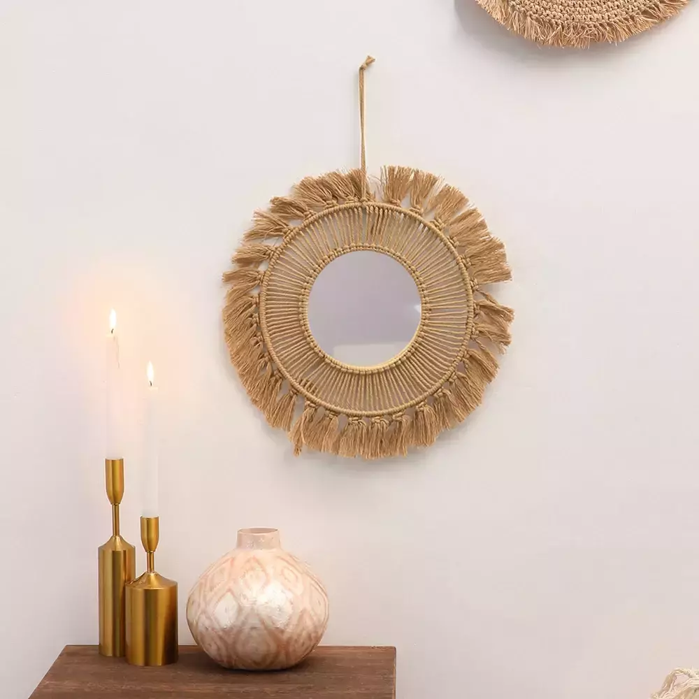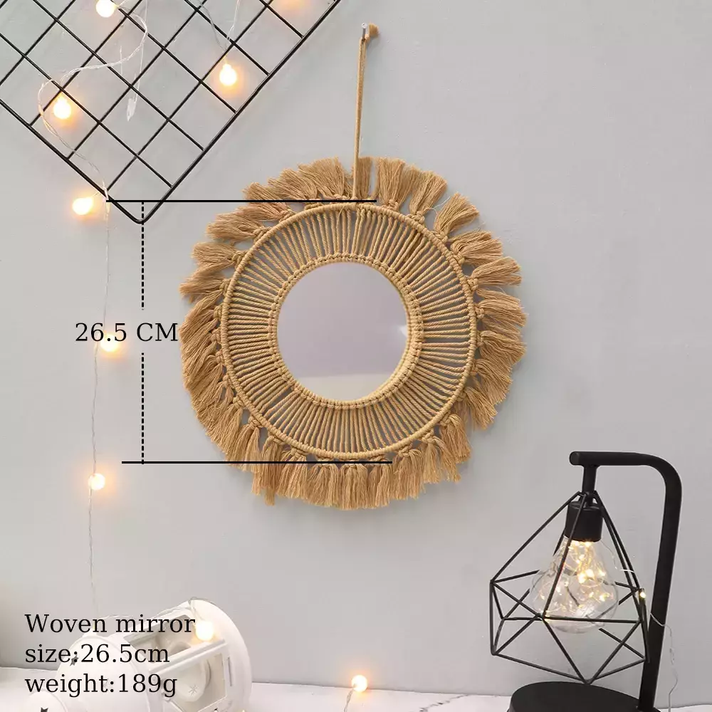Feito com cordão de algodão 100% puro e espelho acrílico de alta qualidade, este espelho é leve, durável e visualmente impactante. Perfeito para quartos, salas, banheiros, halls, cozinhas, home office e até quartos infantis.
